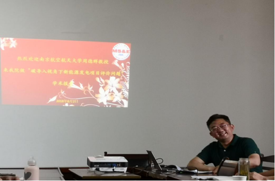 6月2号下午16:00,南京航空航天大学经济与管理学院院长周德群教授来我院会议室做了关于题为“碳导入视角下新能源发电项目评价问题”的学术报告,科研副院长汪和平主持会议,学院领导及全体教师和研究生听取了报告。